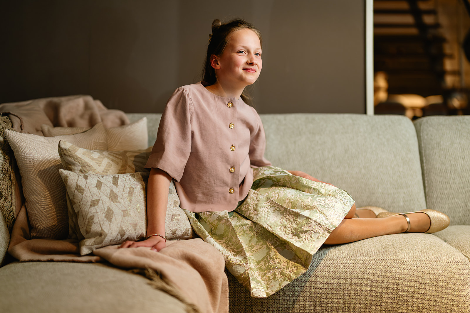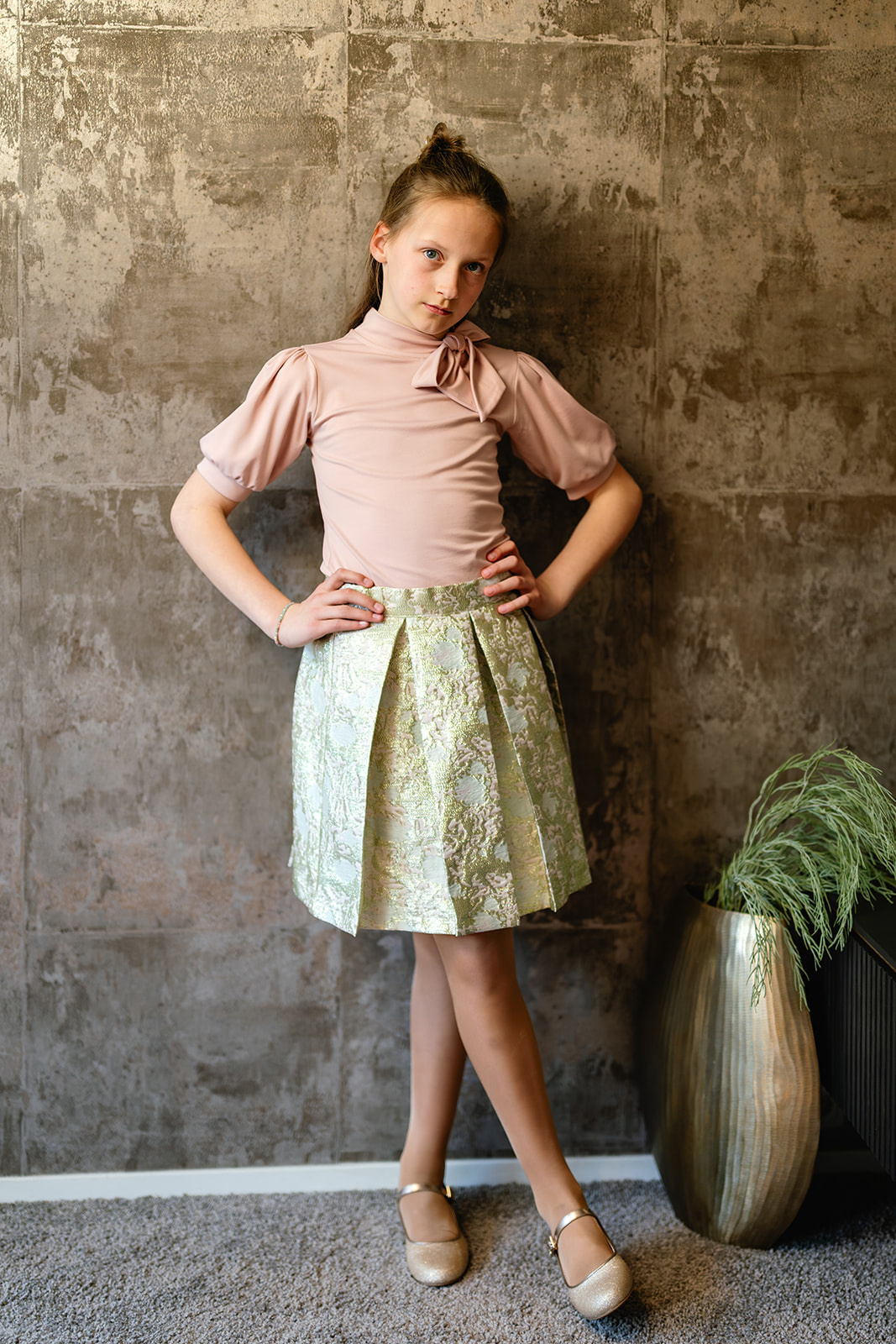 Rok met rondom stolpplooien en een smalle tailleband voorzien van knoopsgaten elastiek. De rok sluit in de zijnaad d.m.v. een goudkleurige rits. Dit exclusieve rokje is gemaakt in een mooie geweven jacquard kwaliteitsstof.