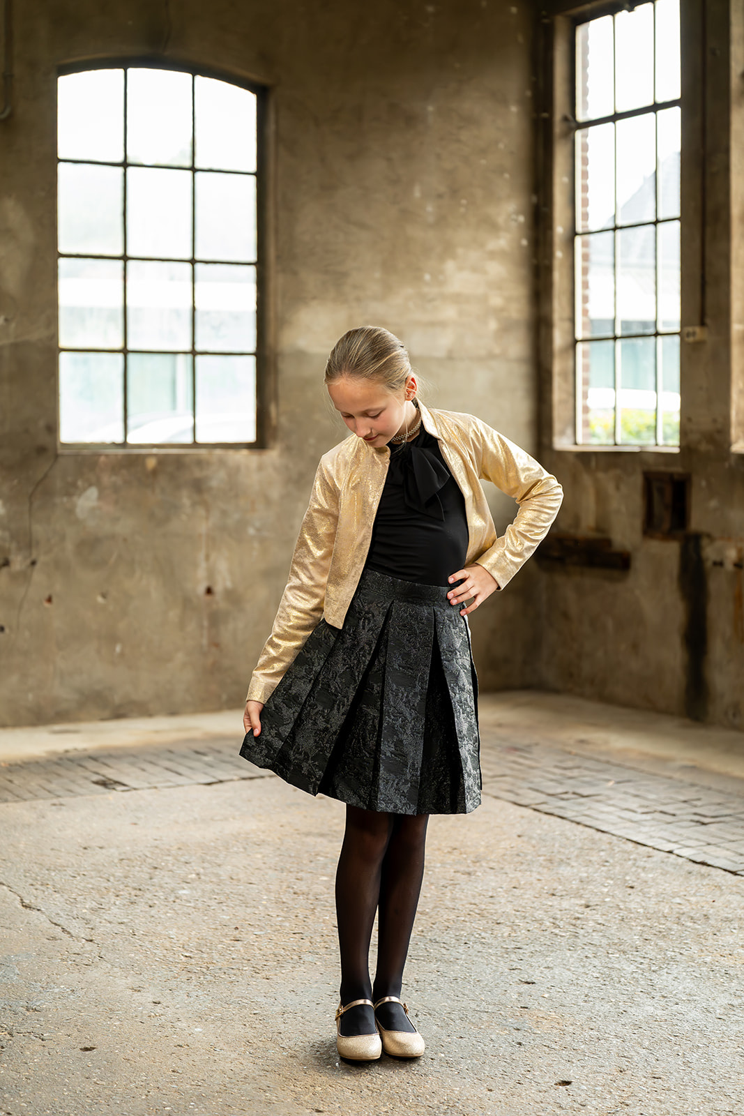 Een top/shirt met lange mouwen en een wat hogere kraagboord uitlopend in brede striklinten. Uiteraard kunnen deze linten op verschillende manieren gelust/gestrikt worden. Deze top/shirt heeft een chique uitstraling en is gemaakt in een luxe tricotkwaliteitstof.