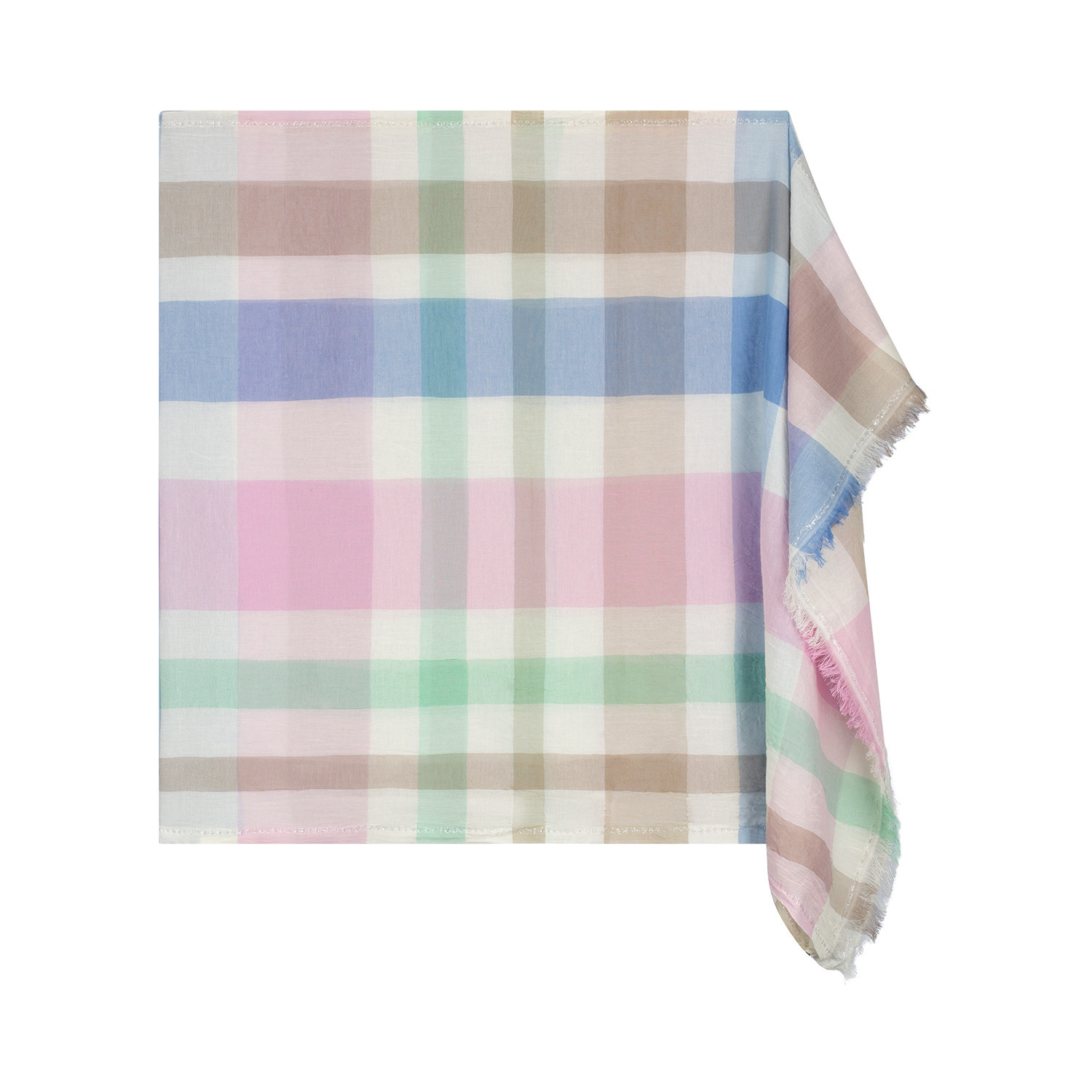 Sjaal met geruite print in roze, blauw, zand kleurstelling. De sjaal heeft een smal franje randje aan de uiteinden.