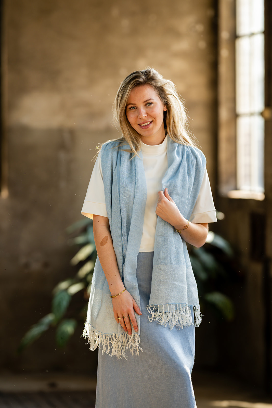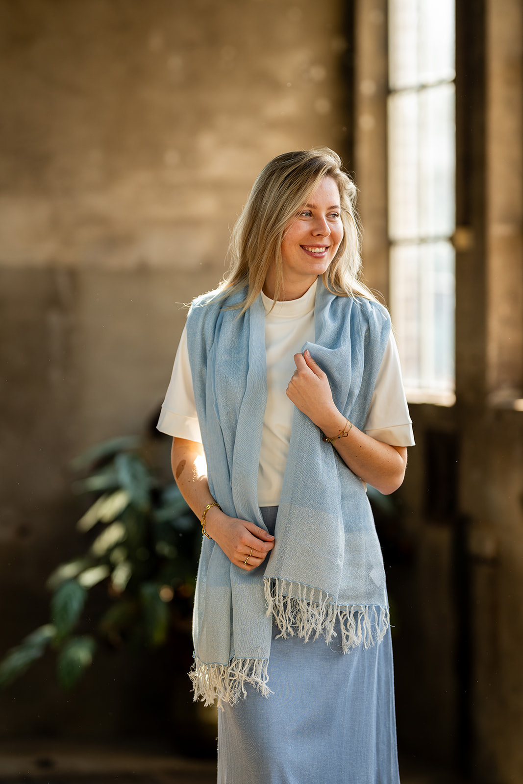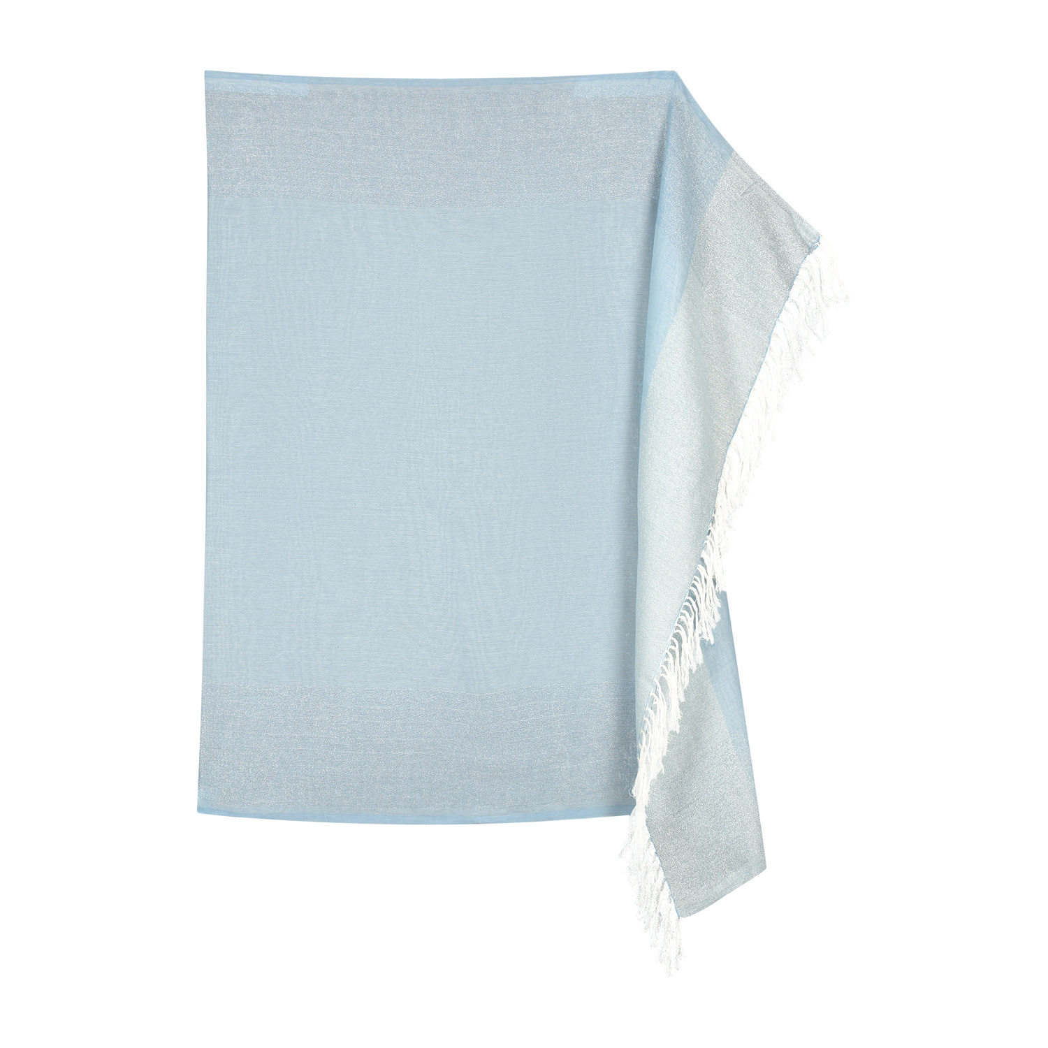 Effen lichtblauwe sjaal met zilverkleurige lurexdraadje in brede strook langs de randen en franjes aan de uiteinden van de sjaal.