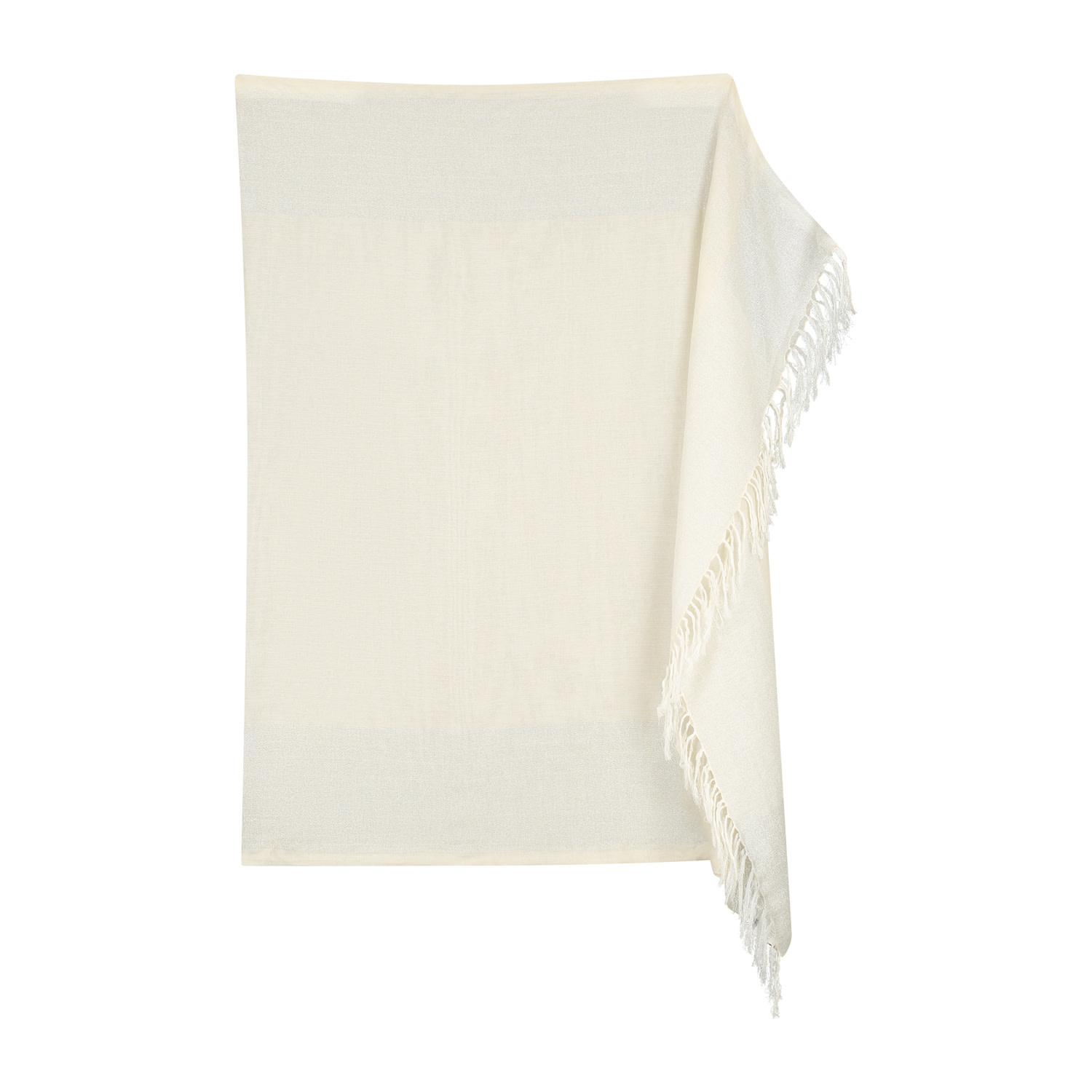 Effen zandkleurige sjaal met zilverkleurige lurexdraadje in brede strook langs de randen en franjes aan de uiteinden van de sjaal.