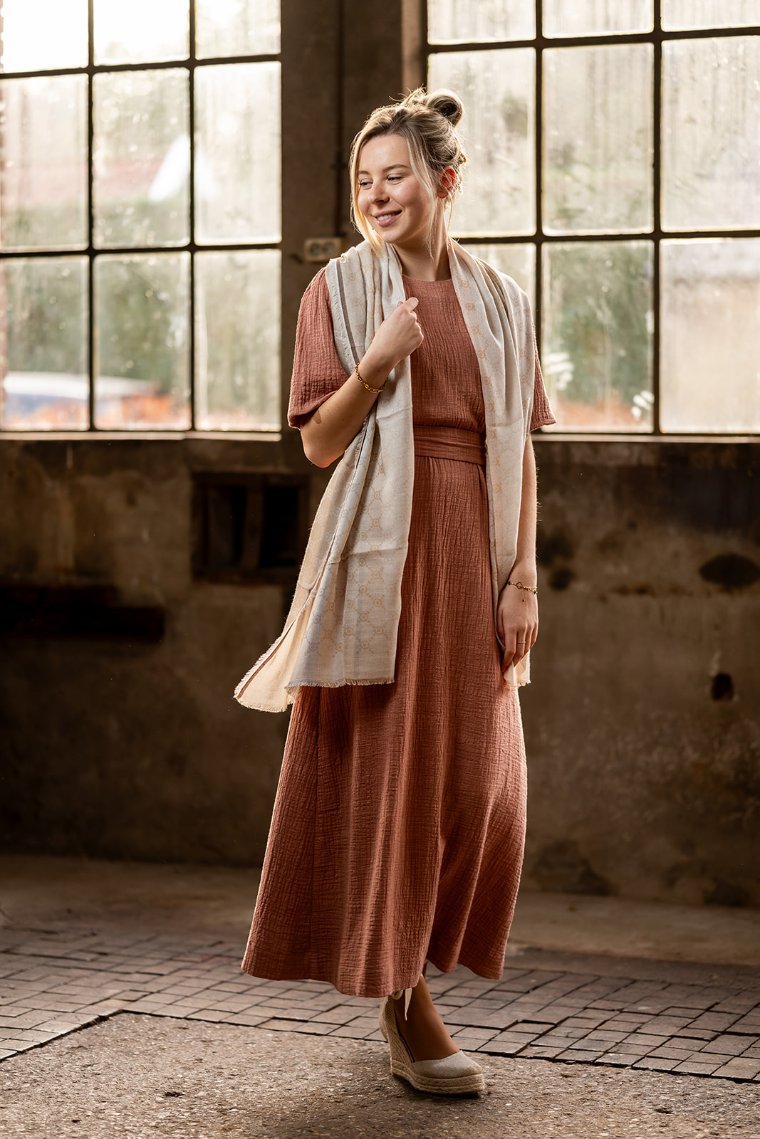 Sjaal met klein printje in pastel kleurstelling. De sjaal heeft een smal franje randje rondom. Kleur zand rose tinten Materiaal 100% katoen Afmeting (bxdxh) 70cm x 180cm ...Sjaal met klein printje in pastel kleurstelling. De sjaal heeft een smal franje randje rondom.Kleurzand rose tintenMateriaal100% katoen Afmeting (bxdxh)70cm x 180cmToon meerToon minder