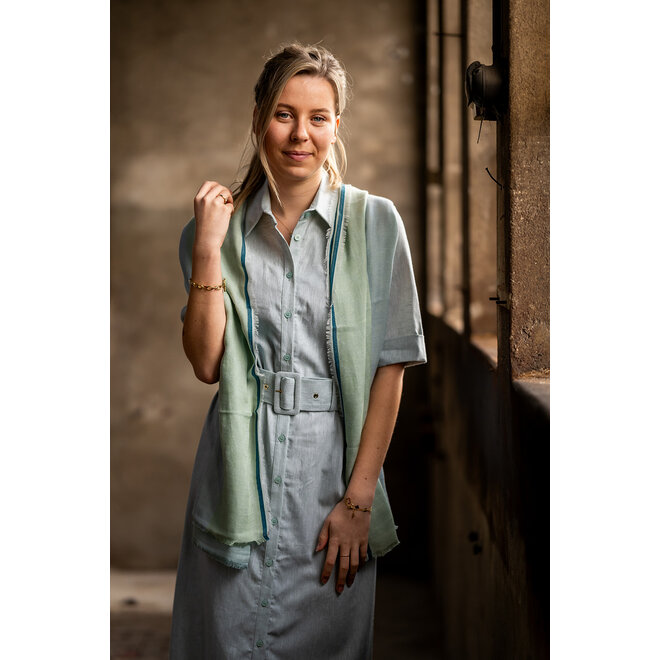 Sjaal met klein printje in groen en blauwe kleurstelling. De sjaal heeft een smal franje randje rondom. Kleur groen blauw tinten Materiaal 100% katoen Afmeting (bxdxh) 70cm x 180...Sjaal met klein printje in groen en blauwe kleurstelling. De sjaal heeft een smal franje randje rondom.Kleurgroen blauw tintenMateriaal100% katoen Afmeting (bxdxh)70cm x 180cmToon meerToon minder