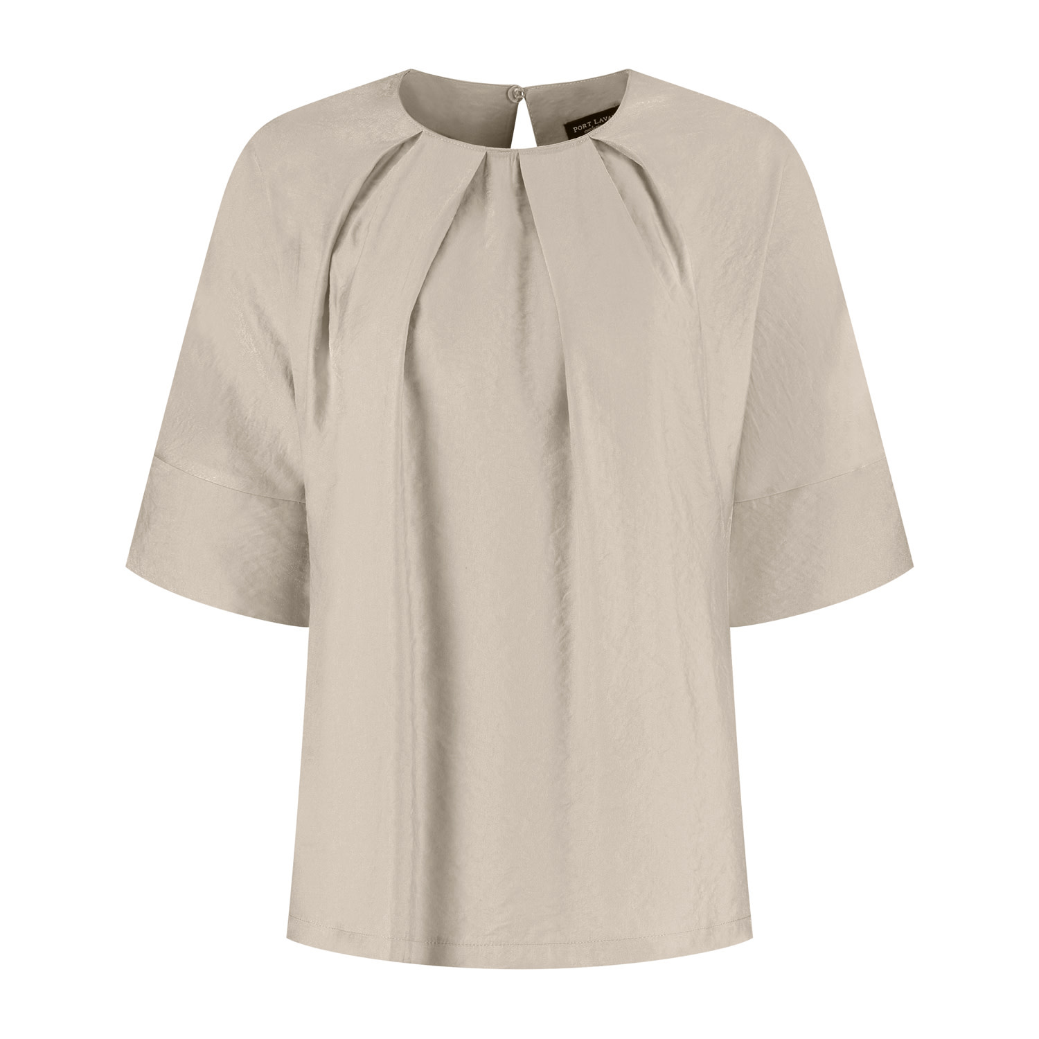 Deze top van Port Lavande heeft een chique uitstraling en qua zandkleurige tint makkelijk te combineren bij zowel een chique als casual outfit. Deze top heeft een ronde halslijn met plooien waardoor het mooi blousend om je heen valt en een perfecte pasvorm geeft. Deze top sluit middenachter d.m.v. een splitje/blind-knoopje en is gemaakt in een chique viscose kwaliteitsstof met een vleugje glans.