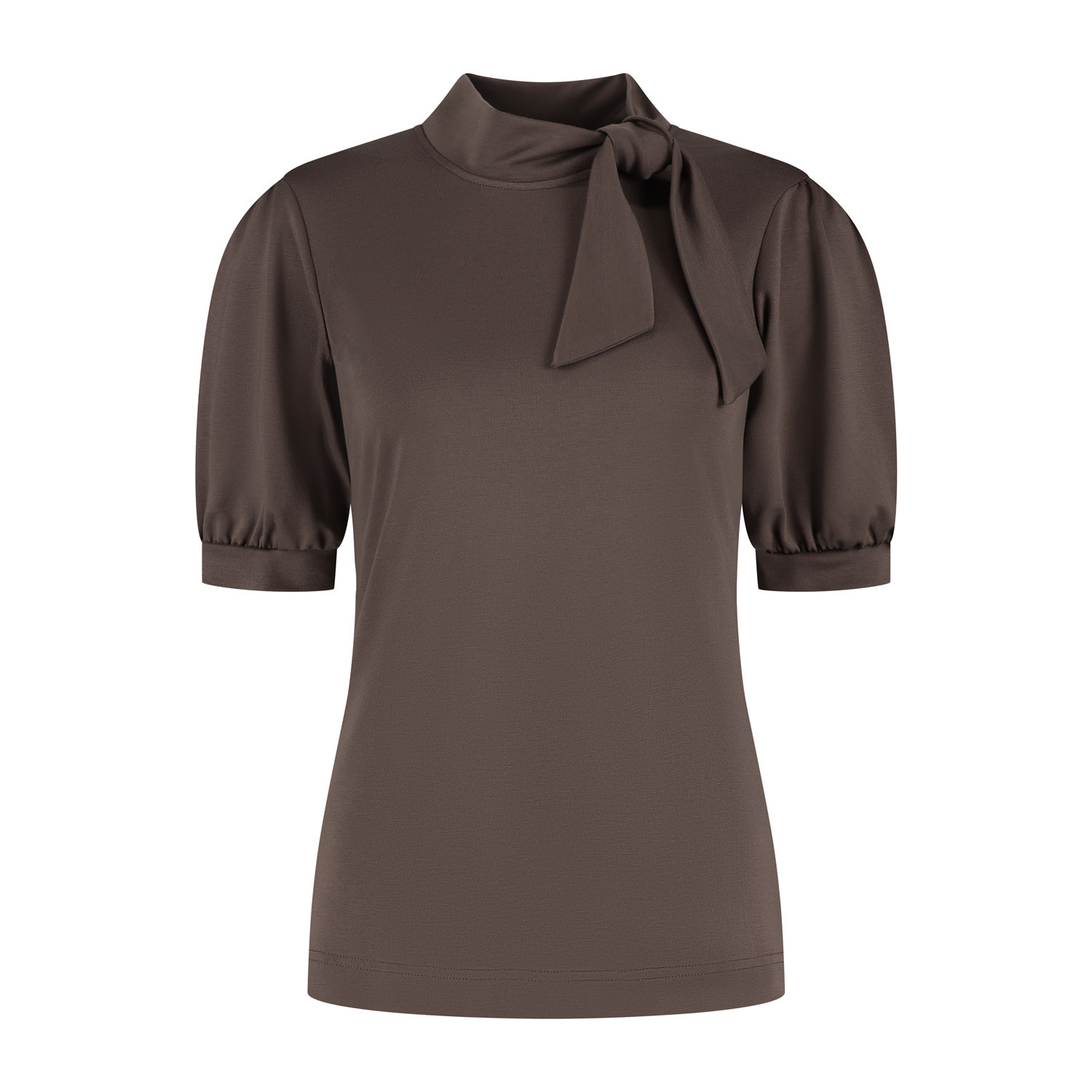 De top Elna in de kleur bruin is een prachtig item die moeiteloos stijl en comfort combineert. De top heeft lichte pofmouwen met een smalboordje en een kraagje met strik/knoop detail bij de hals. Deze top is gemaakt in een zachte duurzame bambo-tricotkwaliteitststof. Een veelzijdige top die je garderobe direct naar een hoger niveau tilt, stijlvol en vrouwelijk.