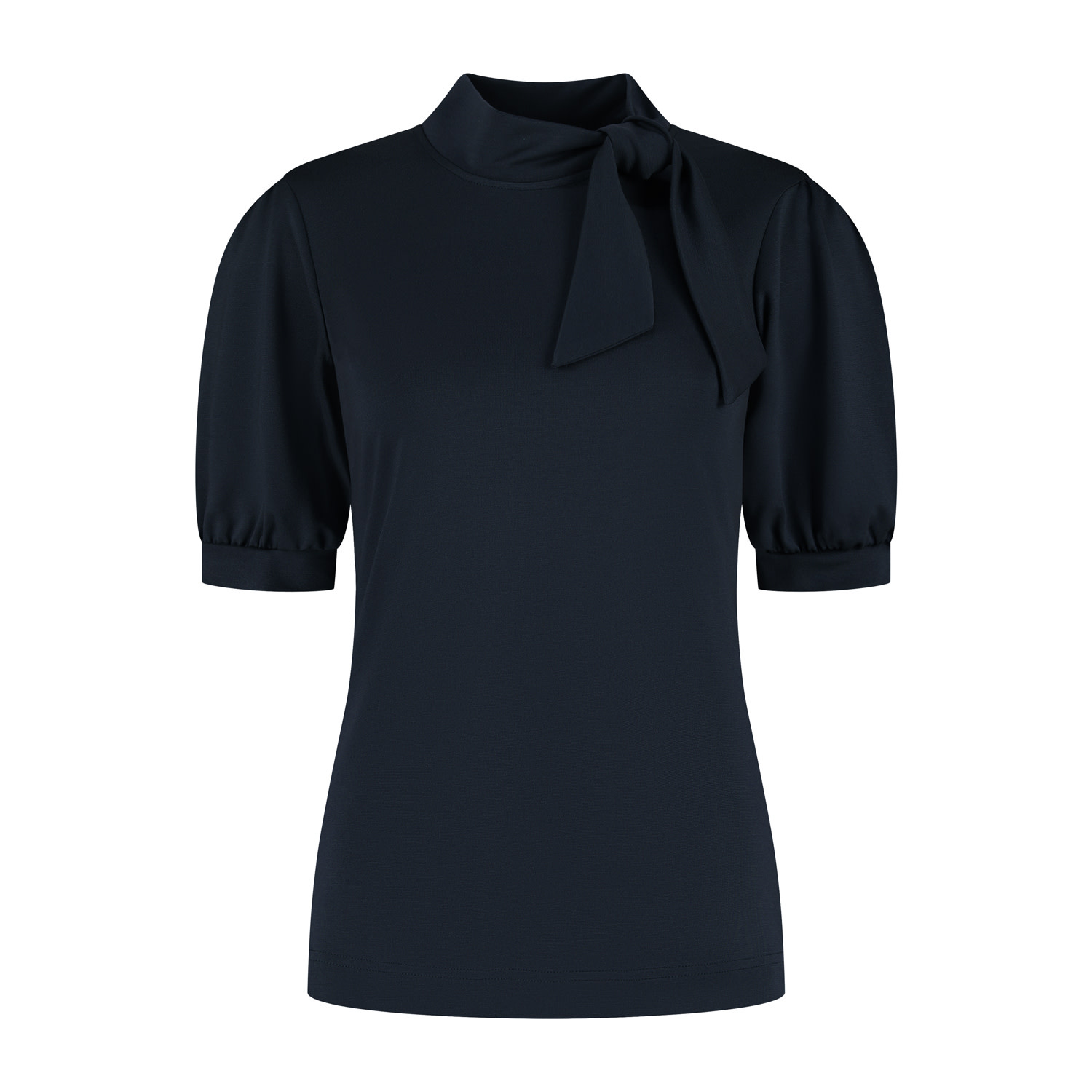 De top Elna in de kleur donkerblauw is een prachtig item die moeiteloos stijl en comfort combineert. De top heeft lichte pofmouwen met een smalboordje en een kraagje met strik/knoop detail bij de hals. Deze top is gemaakt in een zachte duurzame bambo-tricotkwaliteitststof. Een veelzijdige top die je garderobe direct naar een hoger niveau tilt, stijlvol en vrouwelijk.
