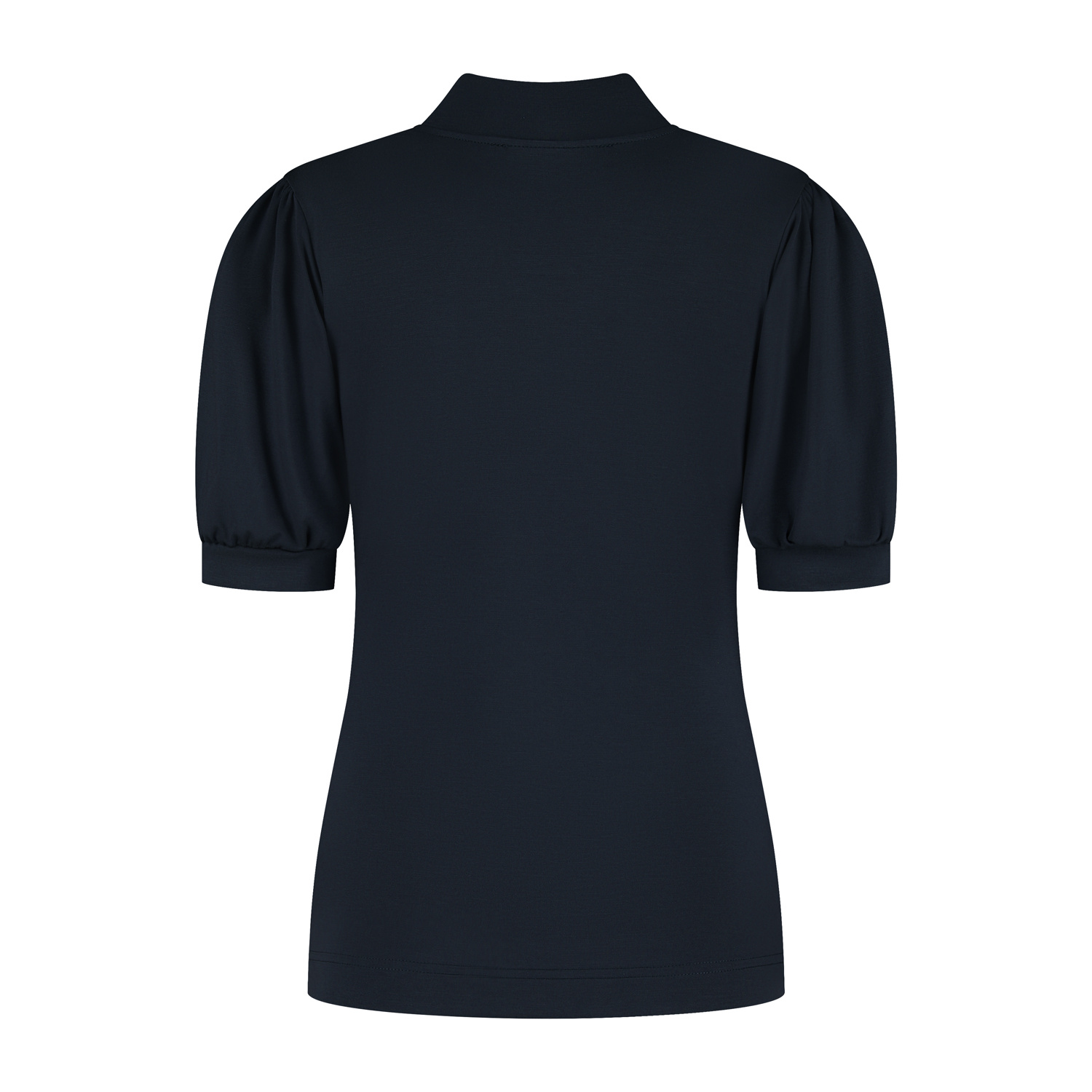 De top Elna in de kleur donkerblauw is een prachtig item die moeiteloos stijl en comfort combineert. De top heeft lichte pofmouwen met een smalboordje en een kraagje met strik/knoop detail bij de hals...