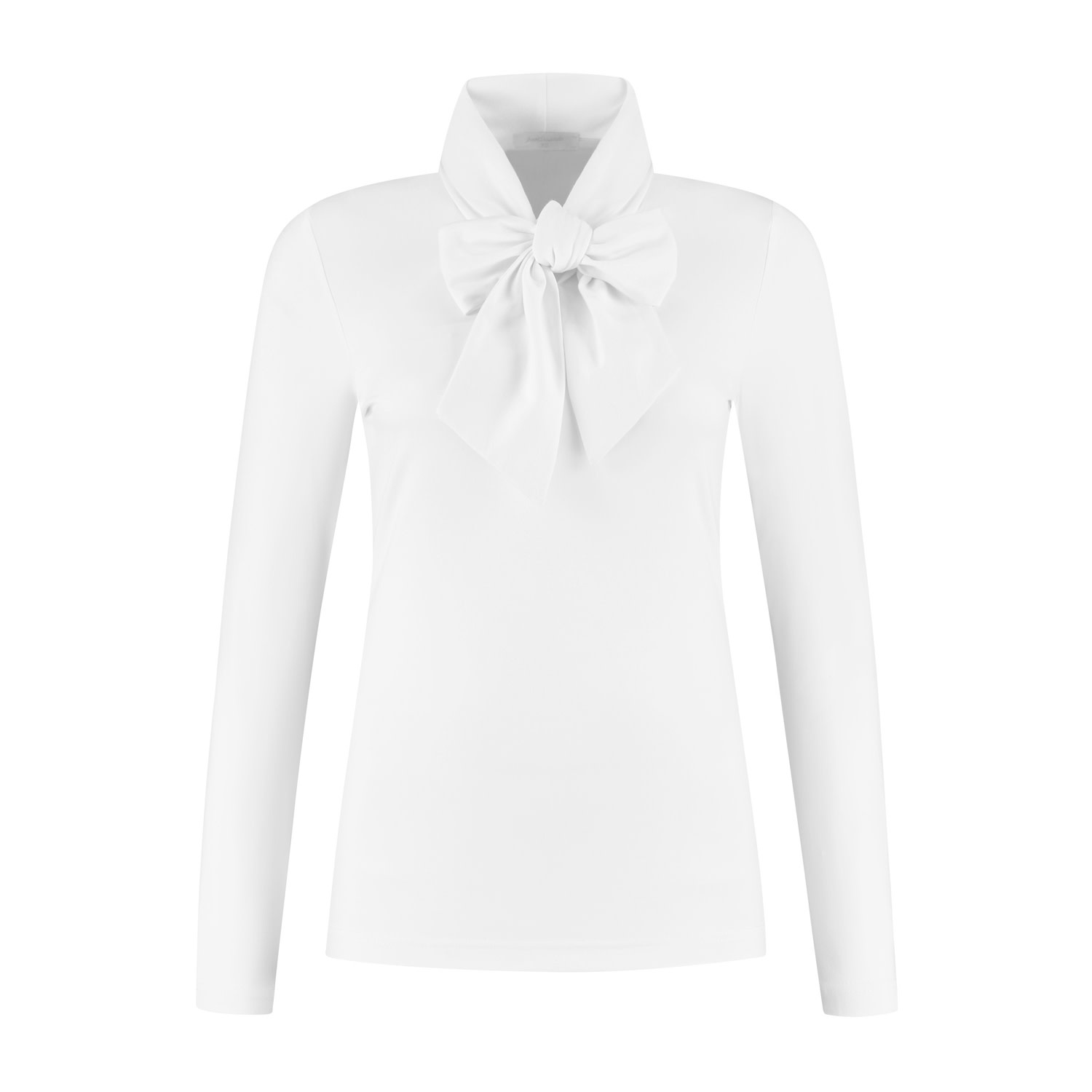Een top/blouse met lange mouwen en een wat hogere kraagboord uitlopend in brede striklinten. Uiteraard kunnen deze linten op verschillende manieren gelust/gestrikt worden. Deze top/blouse heeft een chique uitstraling en is gemaakt in een luxe tricotkwaliteitstof.