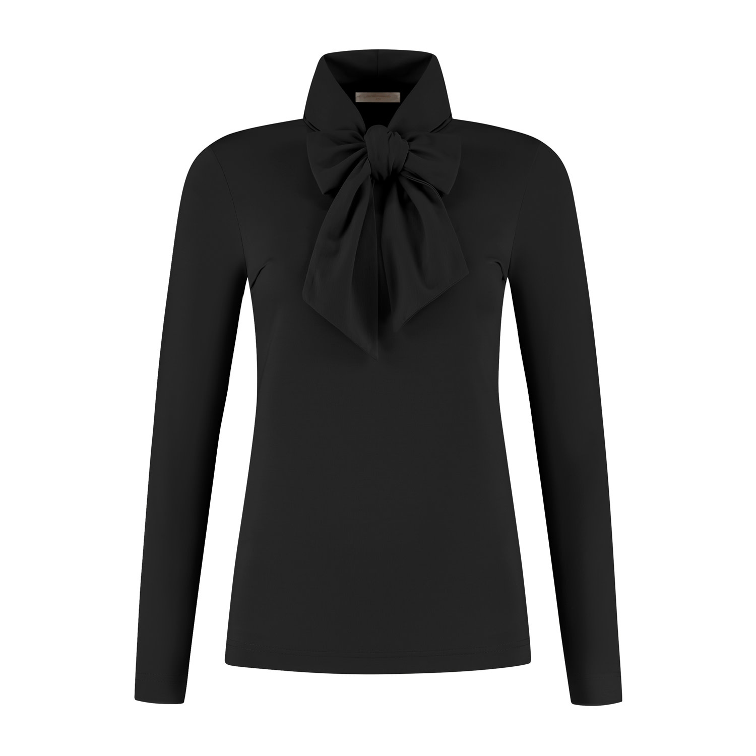Een top/blouse met lange mouwen en een wat hogere kraagboord uitlopend in brede striklinten. Uiteraard kunnen deze linten op verschillende manieren gelust/gestrikt worden. Deze top/blouse heeft een chique uitstraling en is gemaakt in een luxe tricotkwaliteitstof.