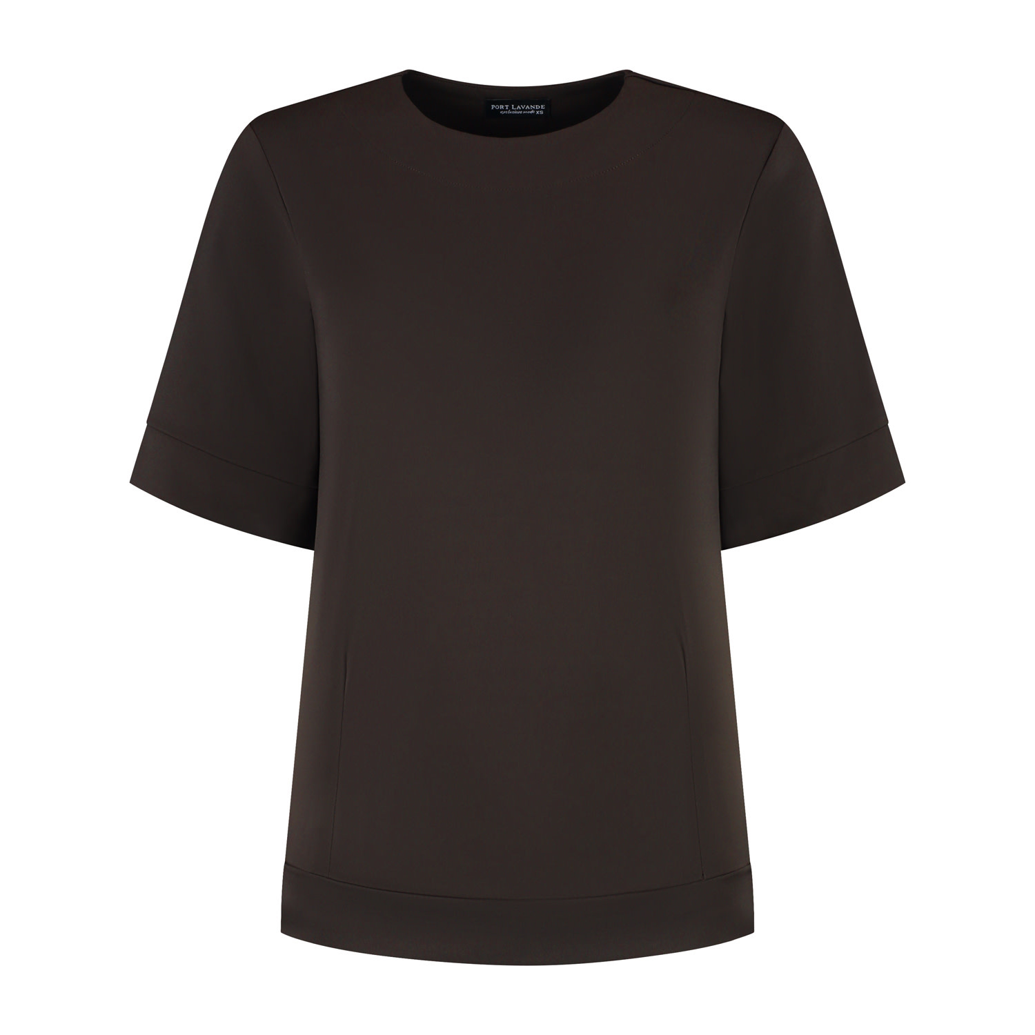 Deze top van Port Lavande heeft een rustige uitstraling en heeft een minimalistisch design. De donkerbruine kleur is makkelijk te combineren en past zowel bij een nette als casual outfit. Deze top heeft een ronde halslijn en een oversized korte mouw en voor de perfecte pasvorm, figuurnaden en een boordje langs de onderrand. Deze top is gemaakt in een mooie stevige travel kwaliteitsstof.