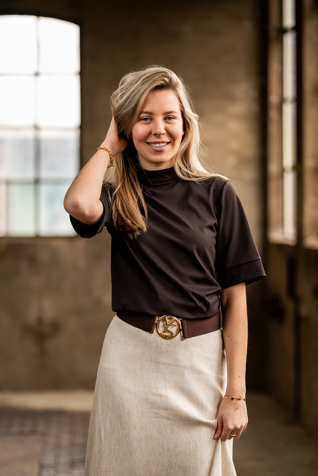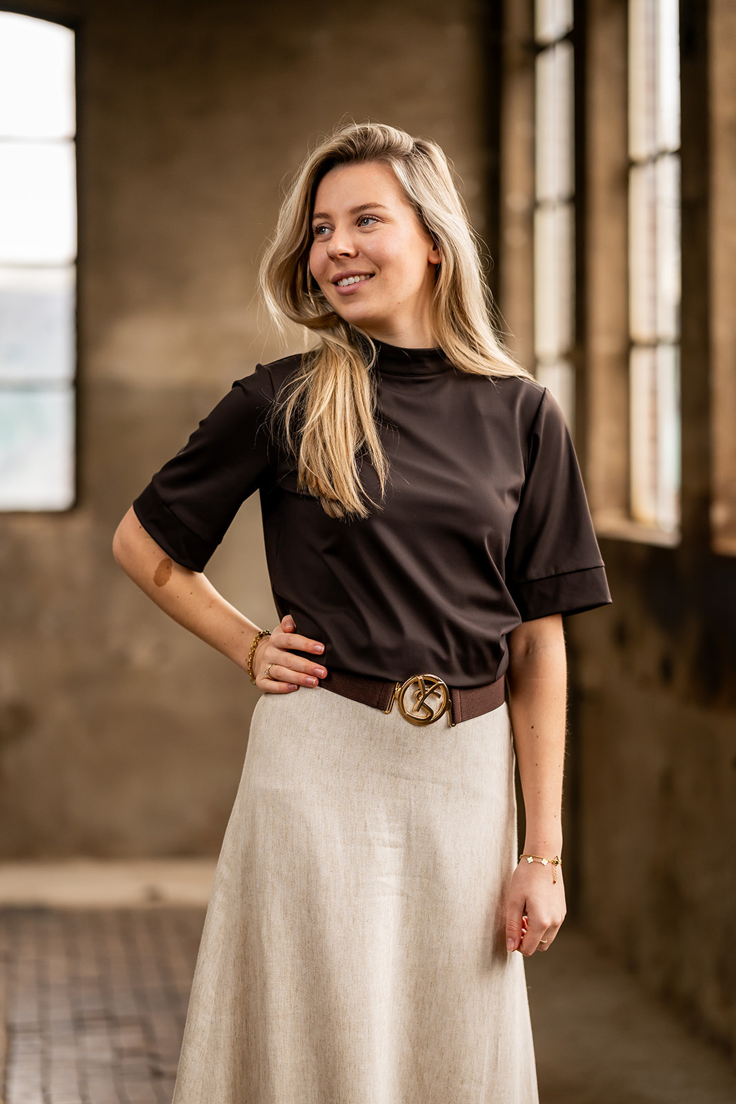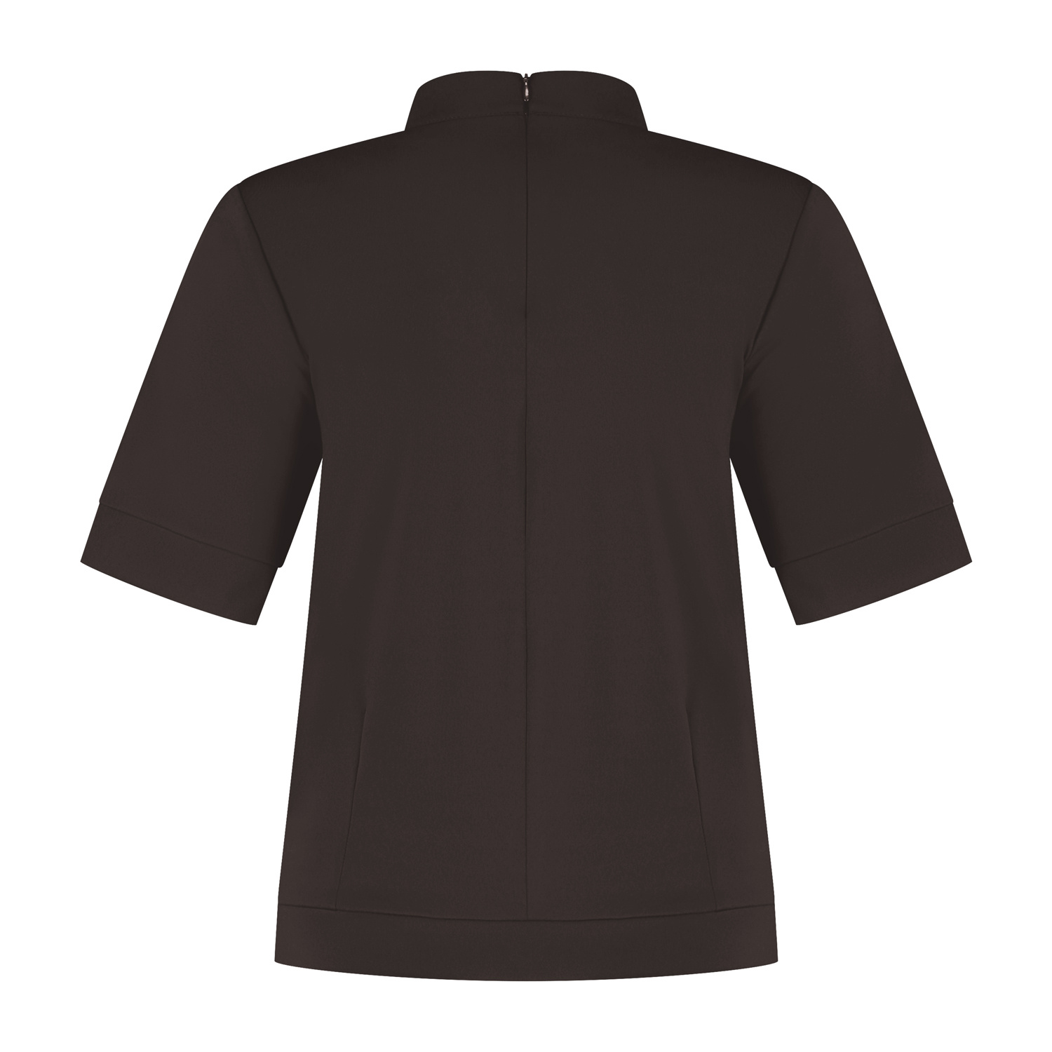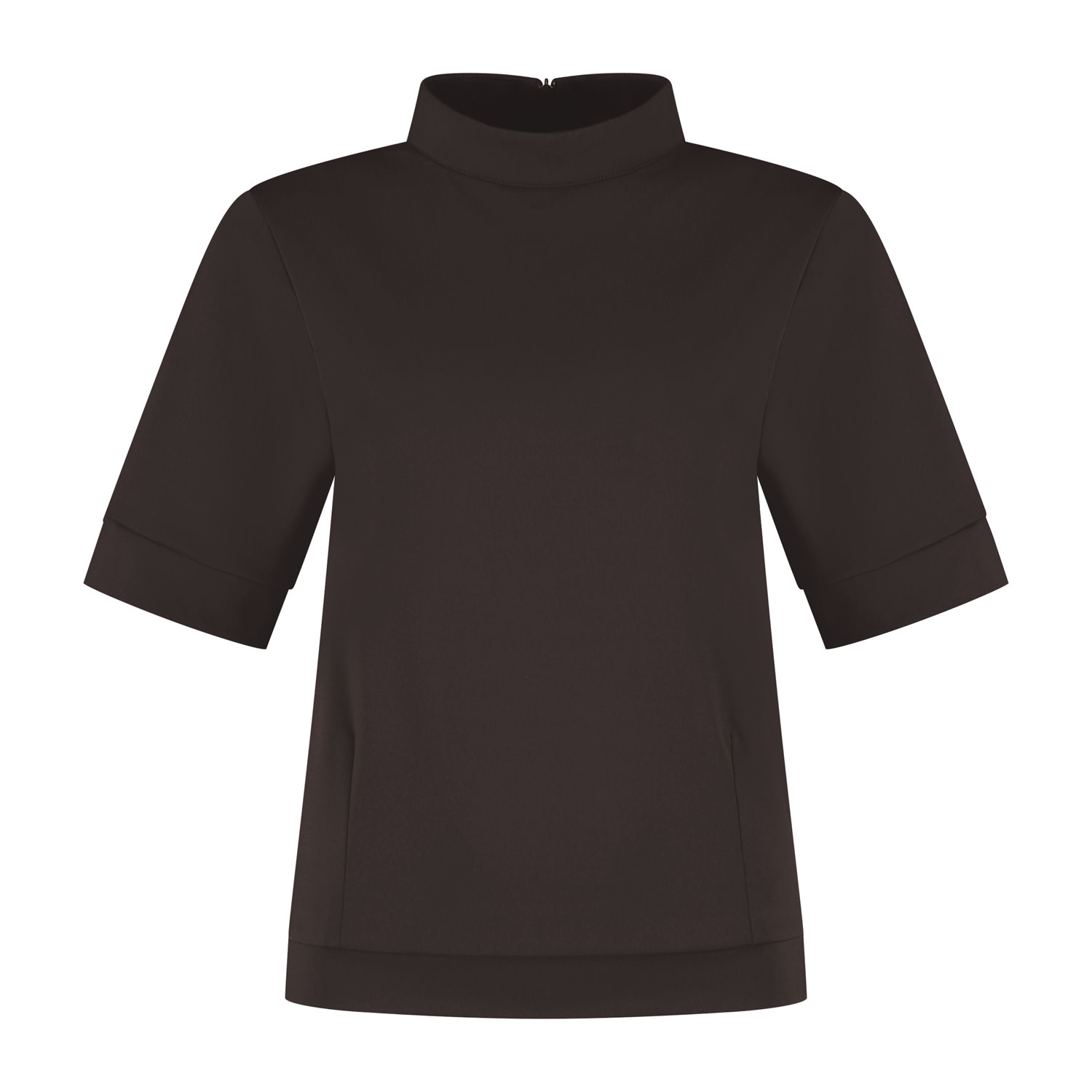 Top/shirt met opstaand boordkraagje en een oversized korte mouw. De top heeft figuurnaden en een boordje langs de onderrand en sluit middenachter d.m.v. een blinde rits. Deze top is gemaakt in een mooie stevige travel kwaliteitsstof.