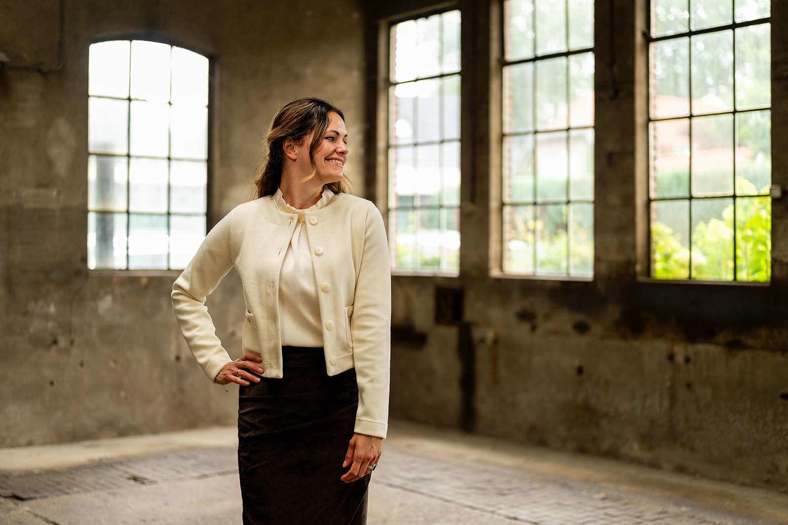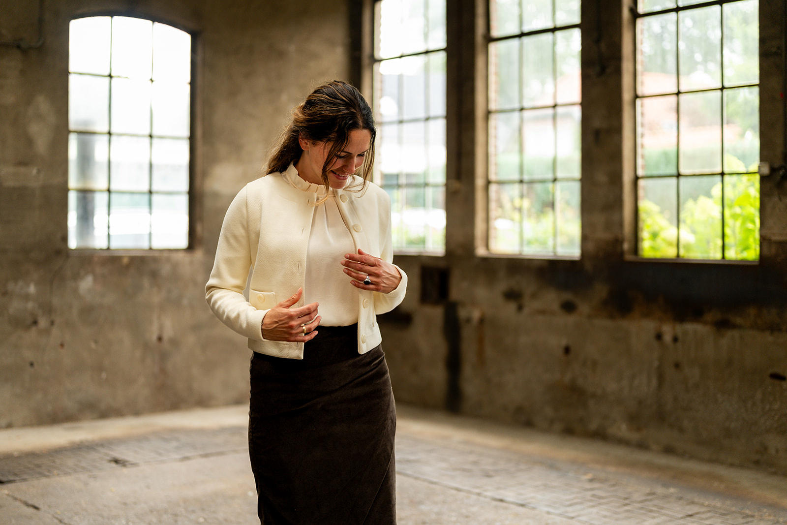 Vestje/jasje met ronde halslijn in een aansluitend model. Het vestje/jasje sluit middenvoor d.m.v. een knopenlijst en heeft 2 zakjes met knoop vooraan. Het jasje is gemaakt in een stevige kwaliteitsstof met iets een relief in de stof.