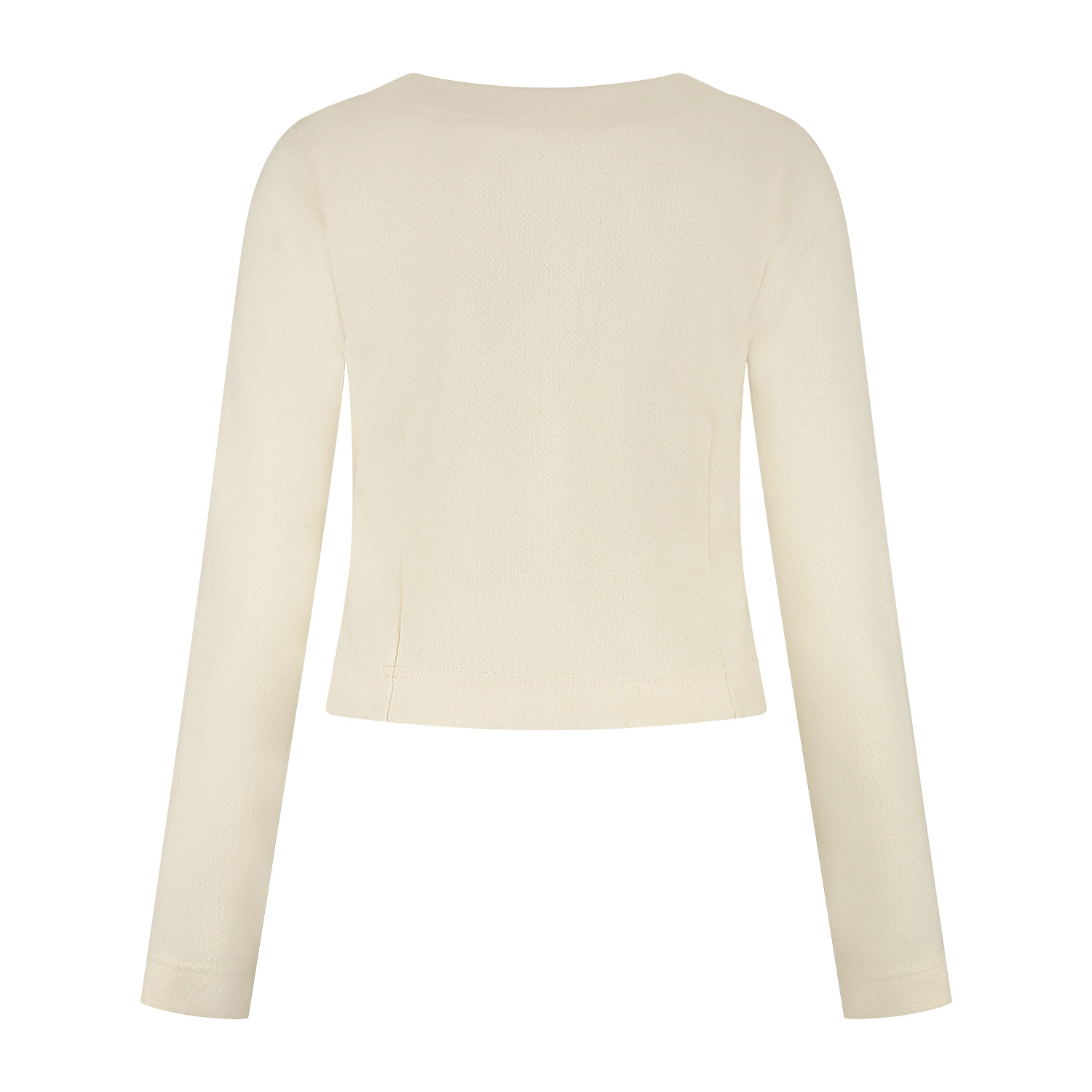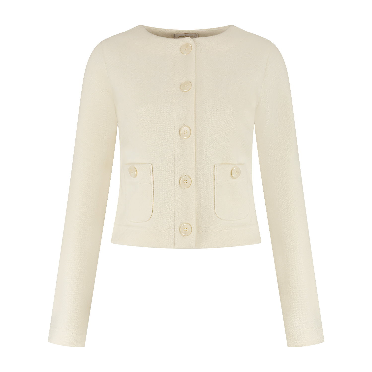 Vestje/jasje met ronde halslijn in een aansluitend model. Het vestje/jasje sluit middenvoor d.m.v. een knopenlijst en heeft 2 zakjes met knoop vooraan. Het jasje is gemaakt in een stevige kwaliteitsst...