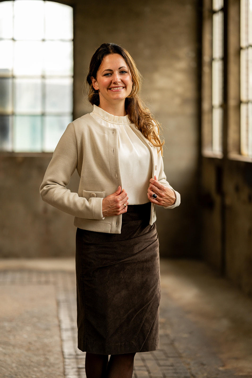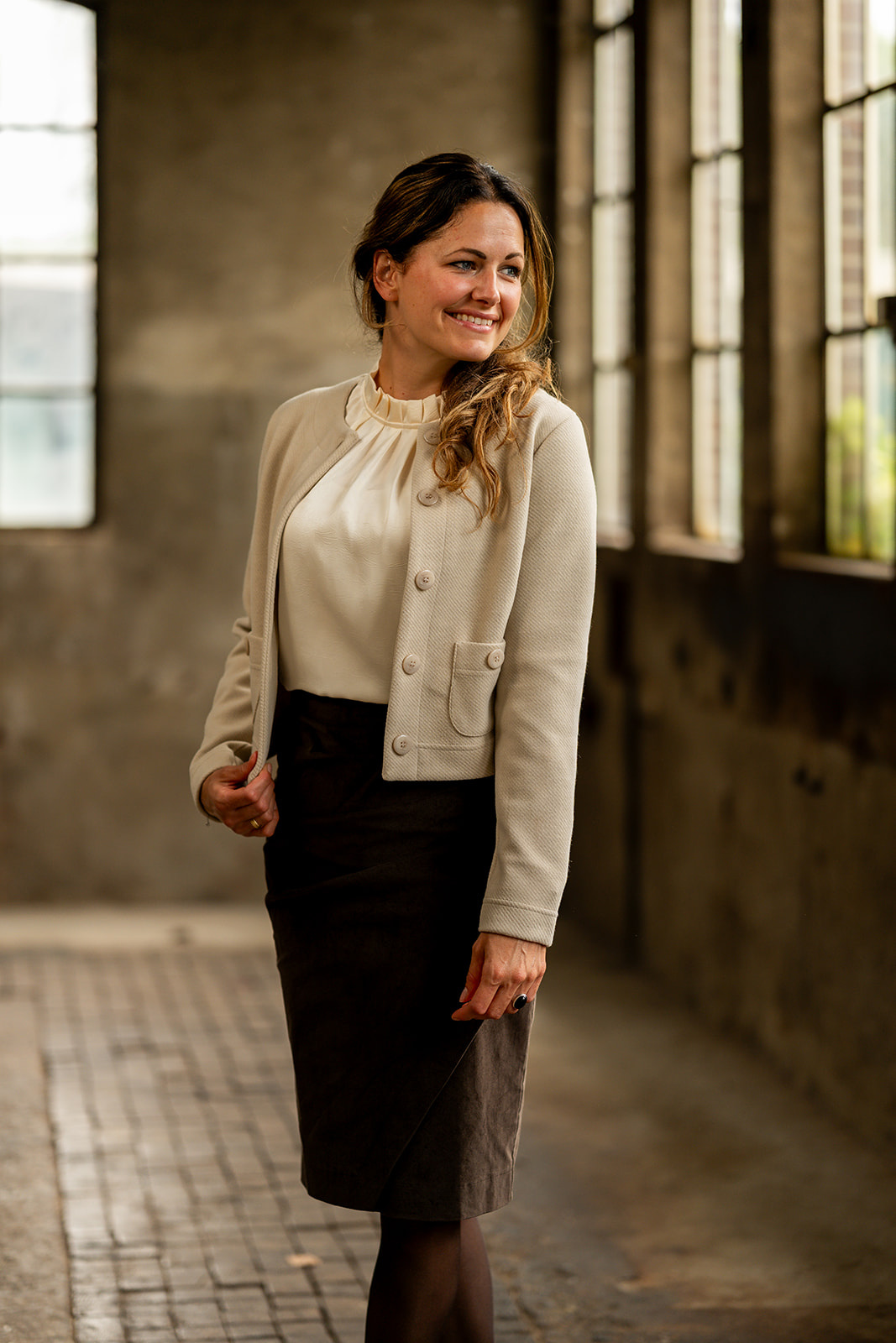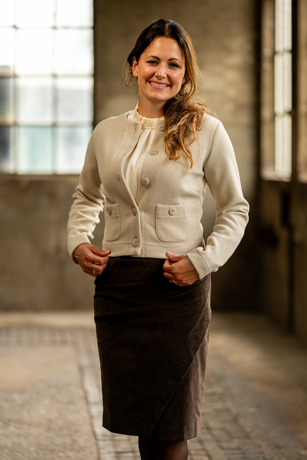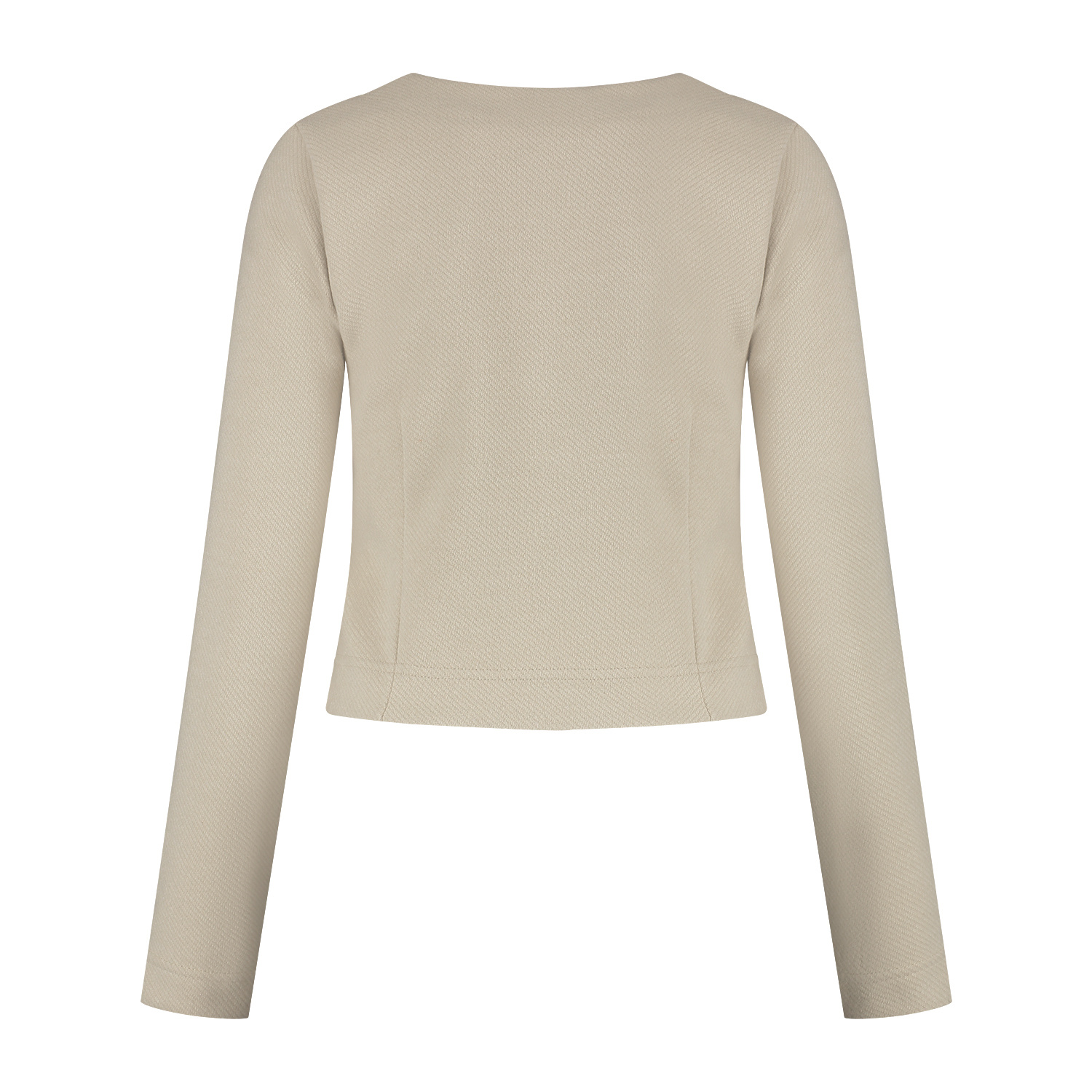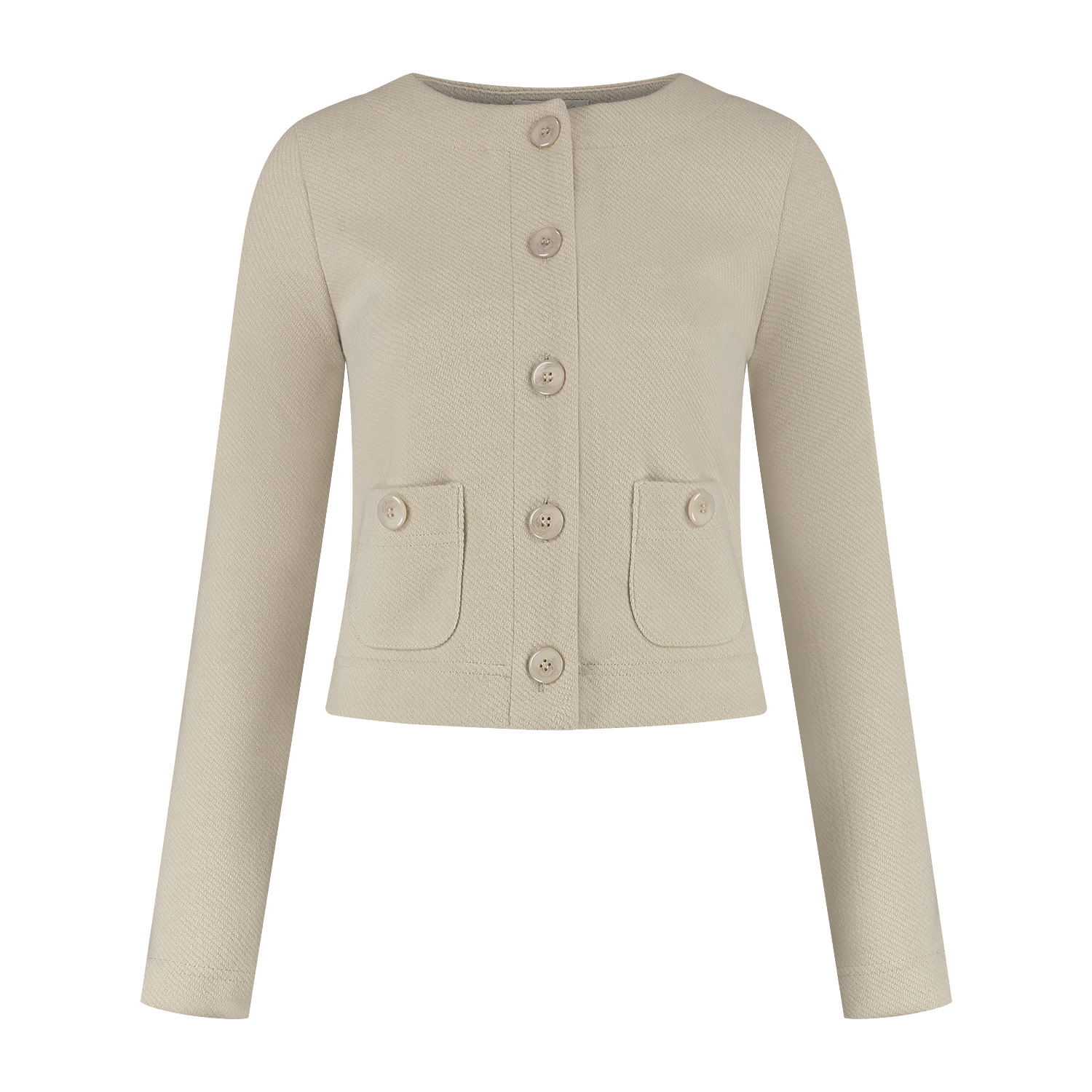 Vestje/jasje met ronde halslijn in een aansluitend model. Het vestje/jasje sluit middenvoor d.m.v. een knopenlijst en heeft 2 zakjes met knoop vooraan. Het jasje is gemaakt in een stevige kwaliteitsstof met iets een relief in de stof.
