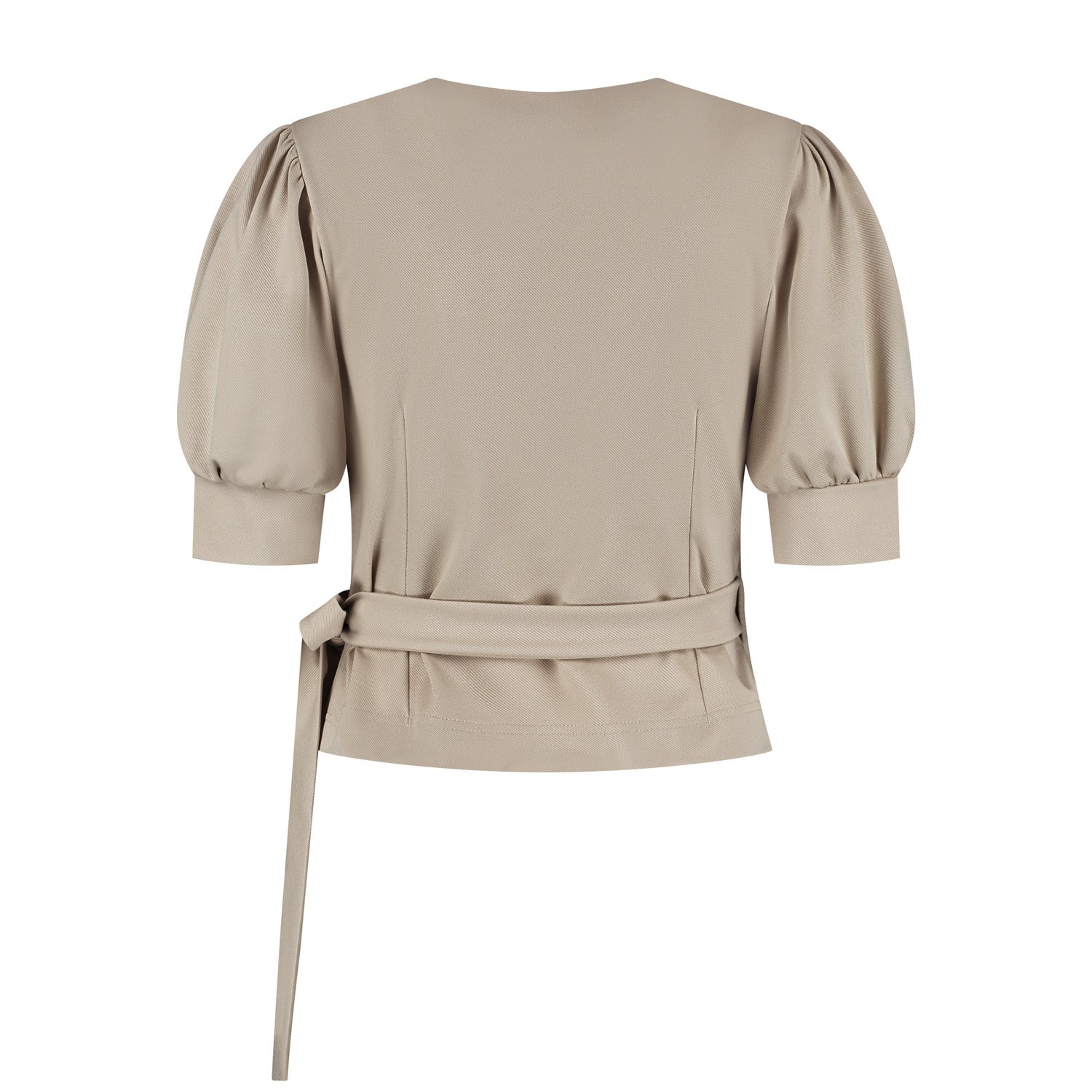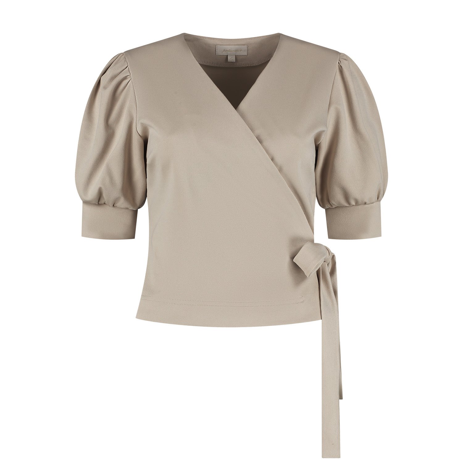 Maak kennis met de wikkeltop Frosien in donkerzand. Een comfortabele en chique wikkeltop met pofmouwen en brede manchetband. Deze top heeft een V-halsbelijning en een royale striksluiting die op meerd...
