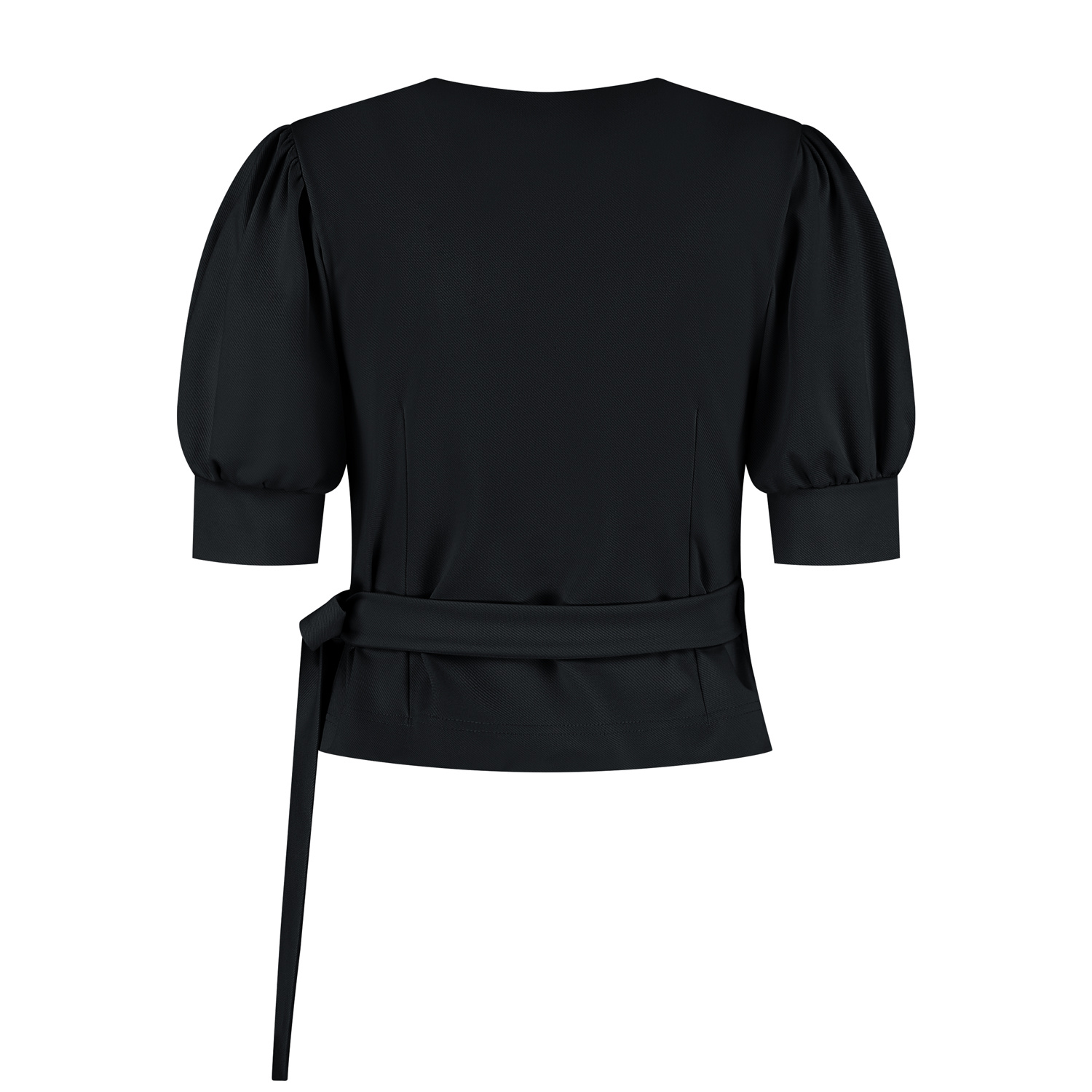 Maak kennis met de wikkeltop Frosien in zwart. Een comfortabele en chique wikkeltop met pofmouwen en brede manchetband. Deze top heeft een V-halsbelijning en een royale striksluiting die op meerdere m...